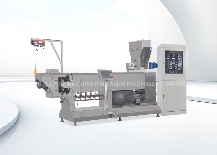 Jinan Saixin Co., Ltd.'s series single-screw extruder is a new type of puffed food equipment, designed and manufactured based on years of research and experience in food extrusion technology to meet the demands of the food and related industries. The equipment includes a control cabinet, transmission system, feeding system, extrusion system, heating system, cooling system, and rotary cutting system. It has been recognized by the Packaging and Food Machinery Association of the Ministry of Mechanical and Electrical Engineering as a leading food machinery product.