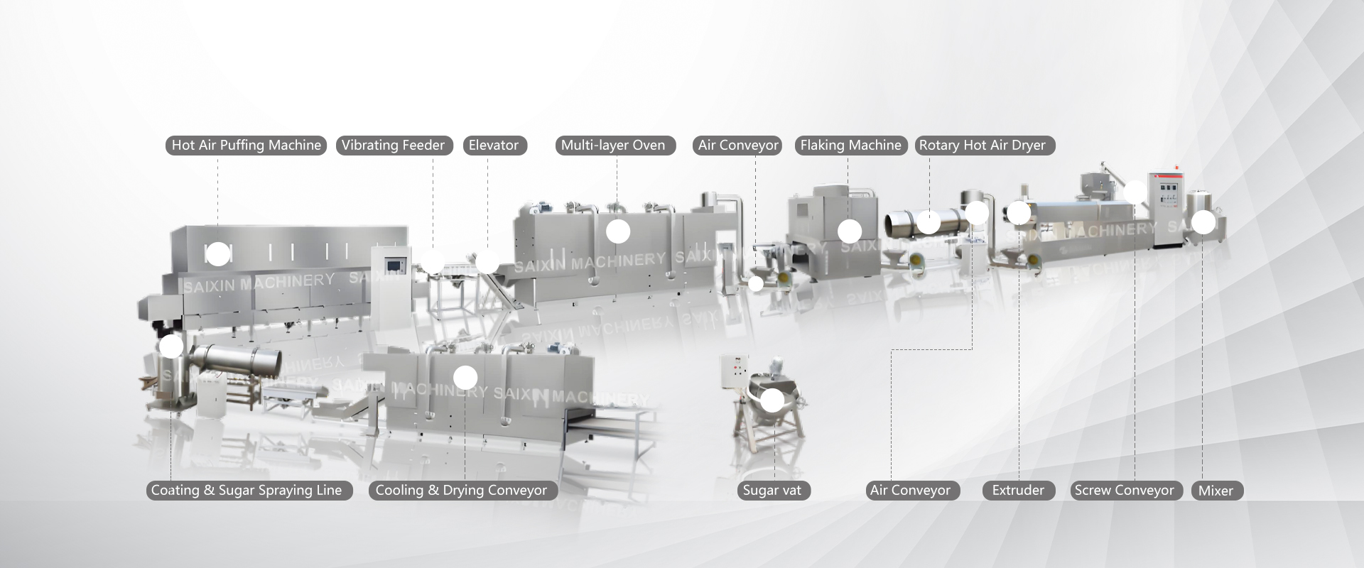 The breakfast cereal production line developed by Jinan Saixin Machinery Co., Ltd. is designed based on grains such as corn flour, oat flour, and other cereal-based raw materials. The extruder processes the materials into granules, rings, or small puffed shapes, which can be directly dried to produce cereal snacks. Alternatively, through flaking, drying, and high-temperature secondary puffing, the line can produce flake-style cereals such as corn flakes and oatmeal flakes.
