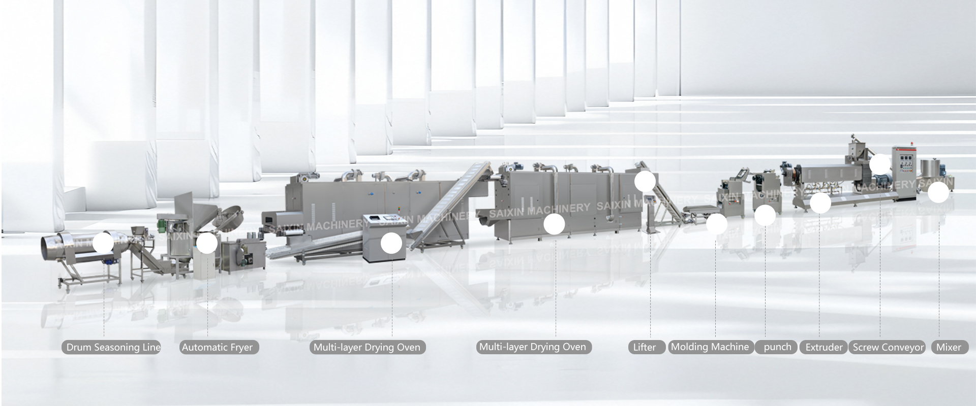 This production line uses corn starch, wheat flour, potato flour, and other grains as the main raw materials. After mixing, the raw materials are fed into the single-screw extruder, which, along with molds and forming equipment, produces various shaped product blanks. The blanks undergo drying, frying, seasoning, and other processes, ultimately producing snack foods in shapes like onion rings, waffle crisps, and more.