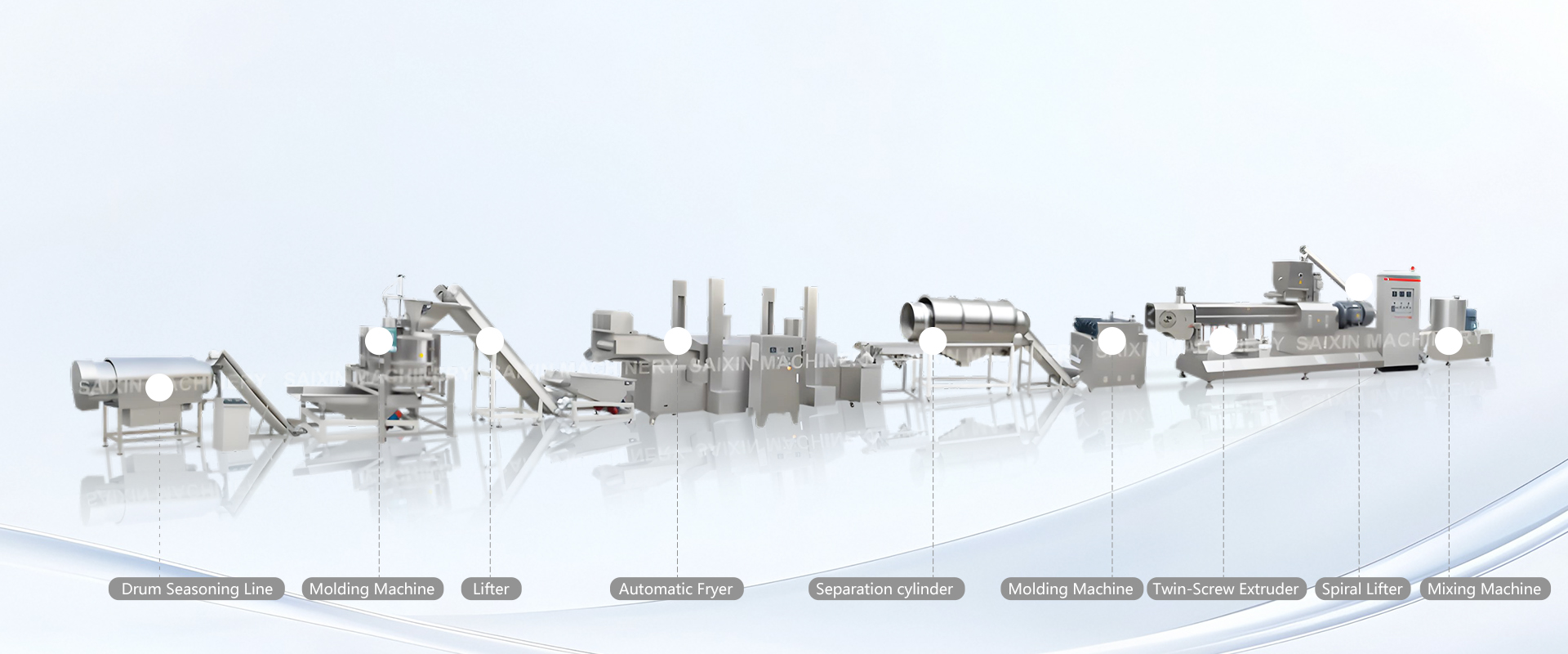 This production line primarily uses corn starch, wheat flour, potato flour, and other grains as raw materials. After mixing and blending, the raw materials are extruded and puffed using a twin-screw food extruder and molded into various shapes. The shapes can be customized based on customer requirements, including but not limited to triangle, round, spiral, shell, and others, meeting the market's demand for diverse snacks. After drying, frying, and seasoning, the line produces flavorful puffed snacks.